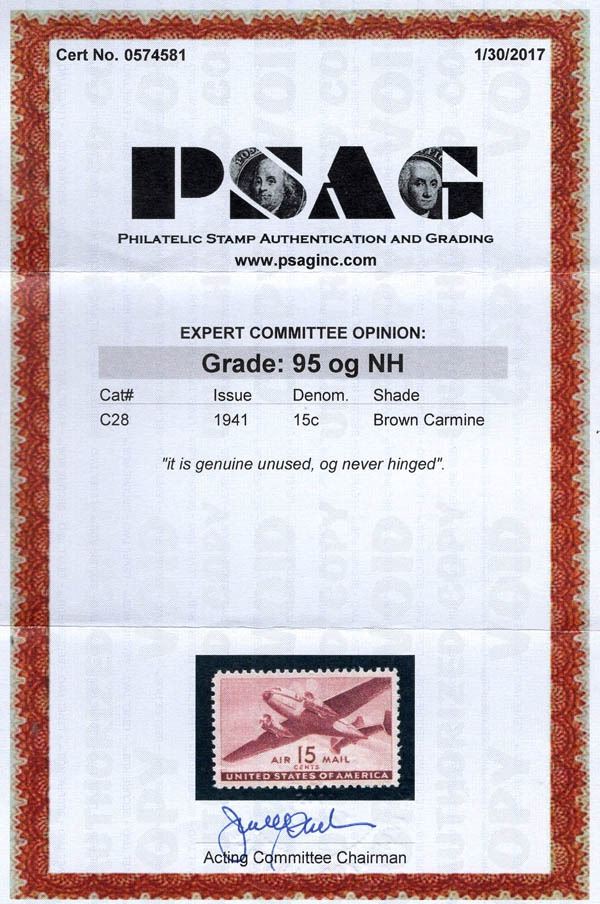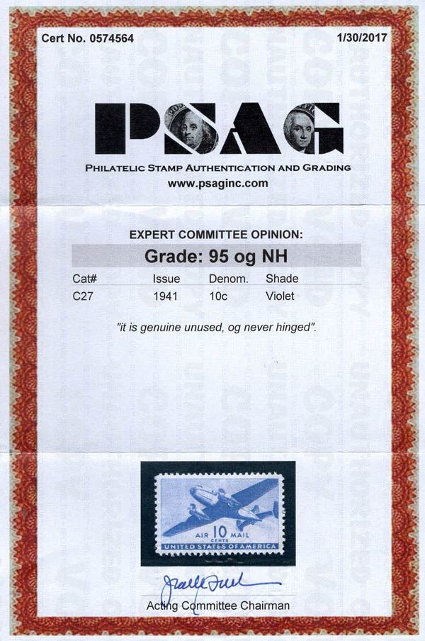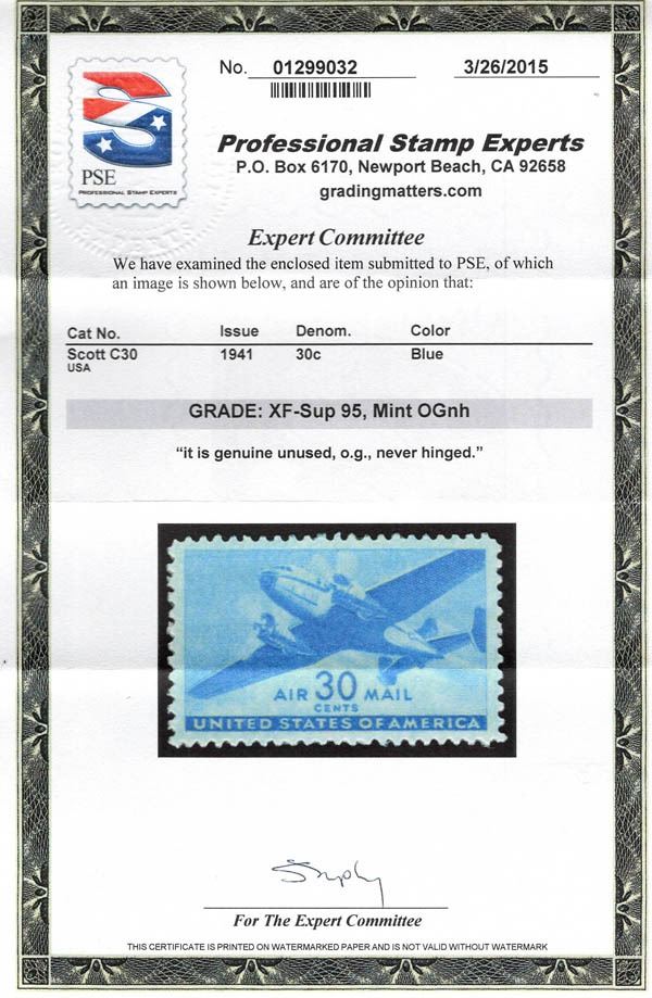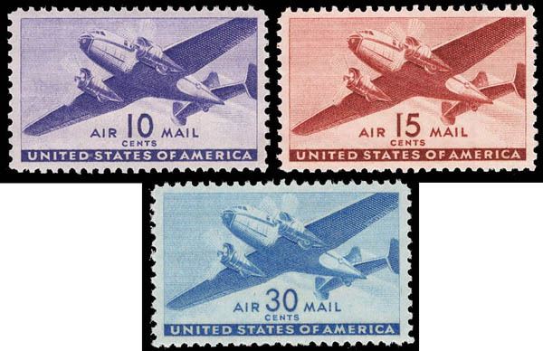 Airmail, 1941, 10¢, 15¢ and 30¢ Transport. Scott C27, C28, C30. SMQ $135, XF-SUP, with 2017 P.S.A.G. and 2015 P.S.E. certificates all graded XF-SUP 95