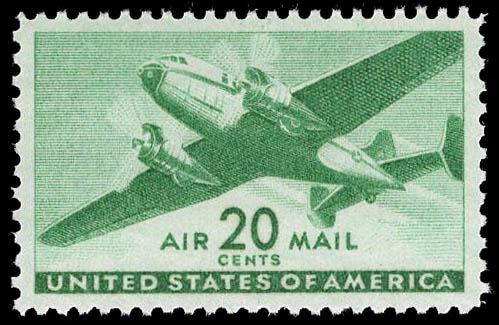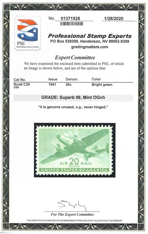 Airmail, 1941, 20¢ Transport. Scott C29. SMQ $175, Sup, with 2020 P.S.E. certificate graded SUP 98