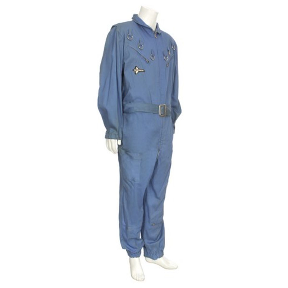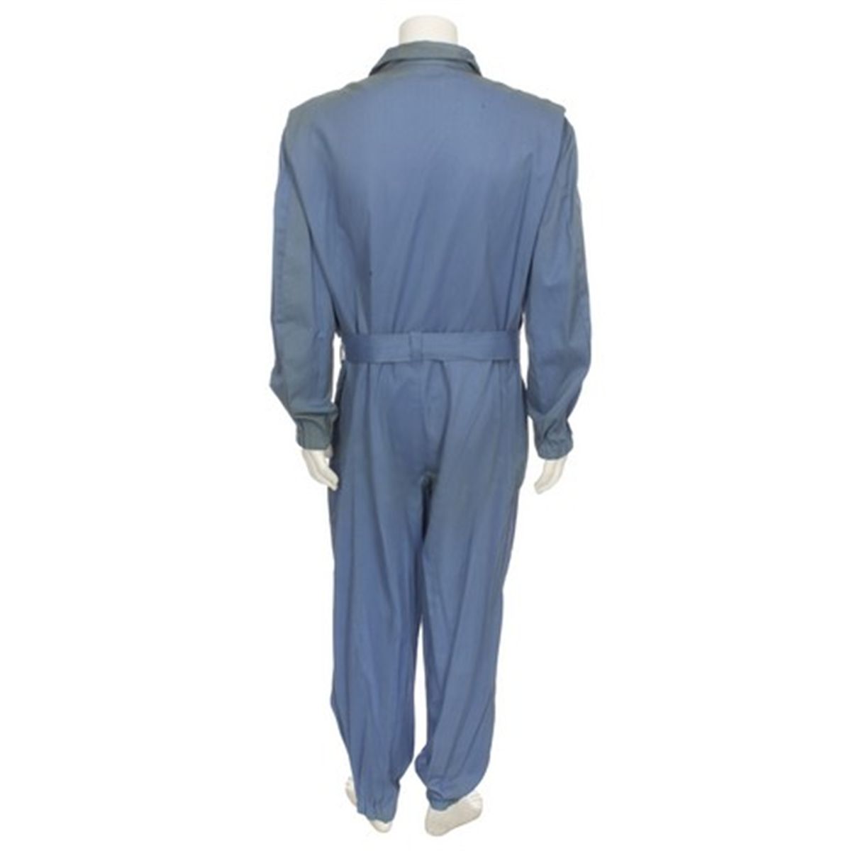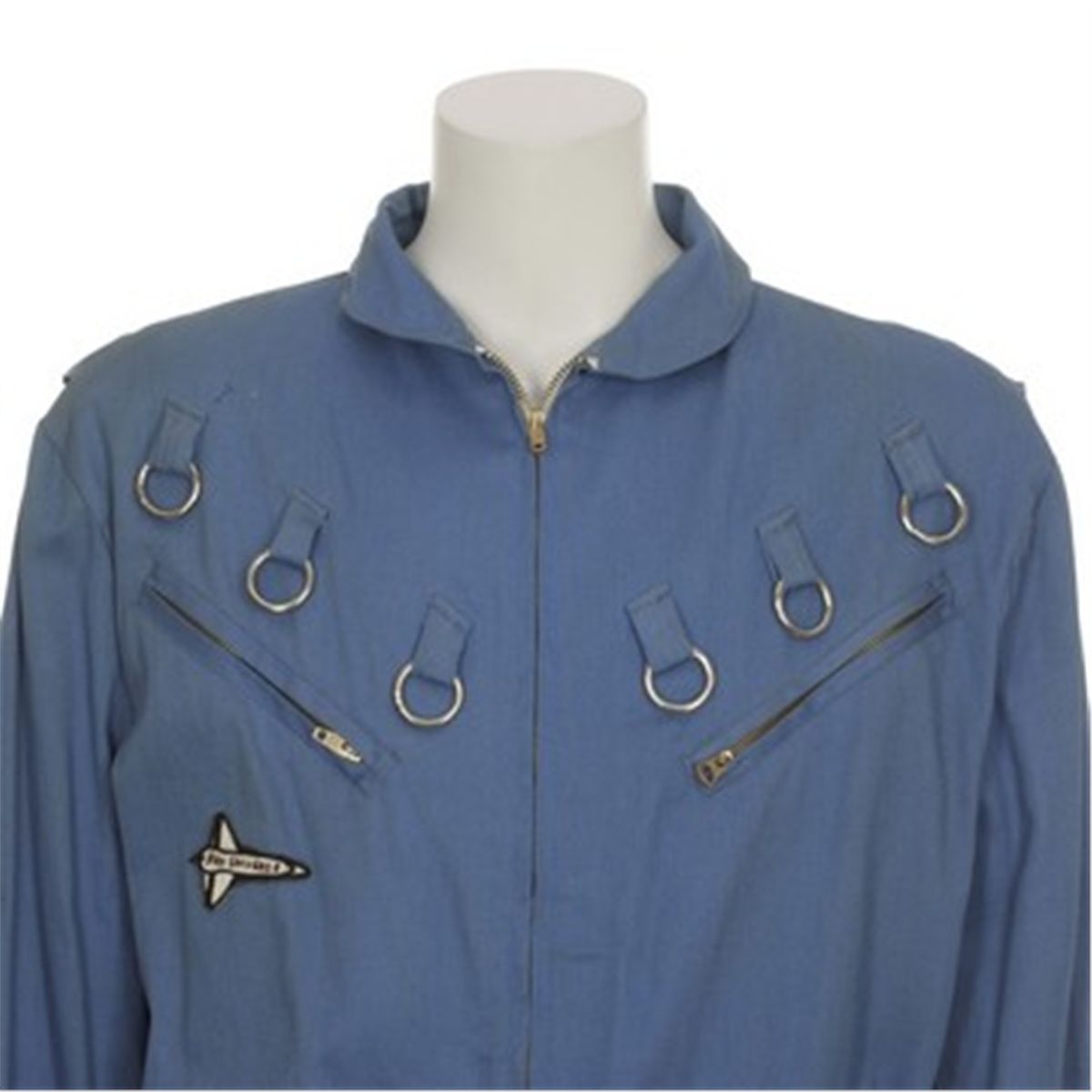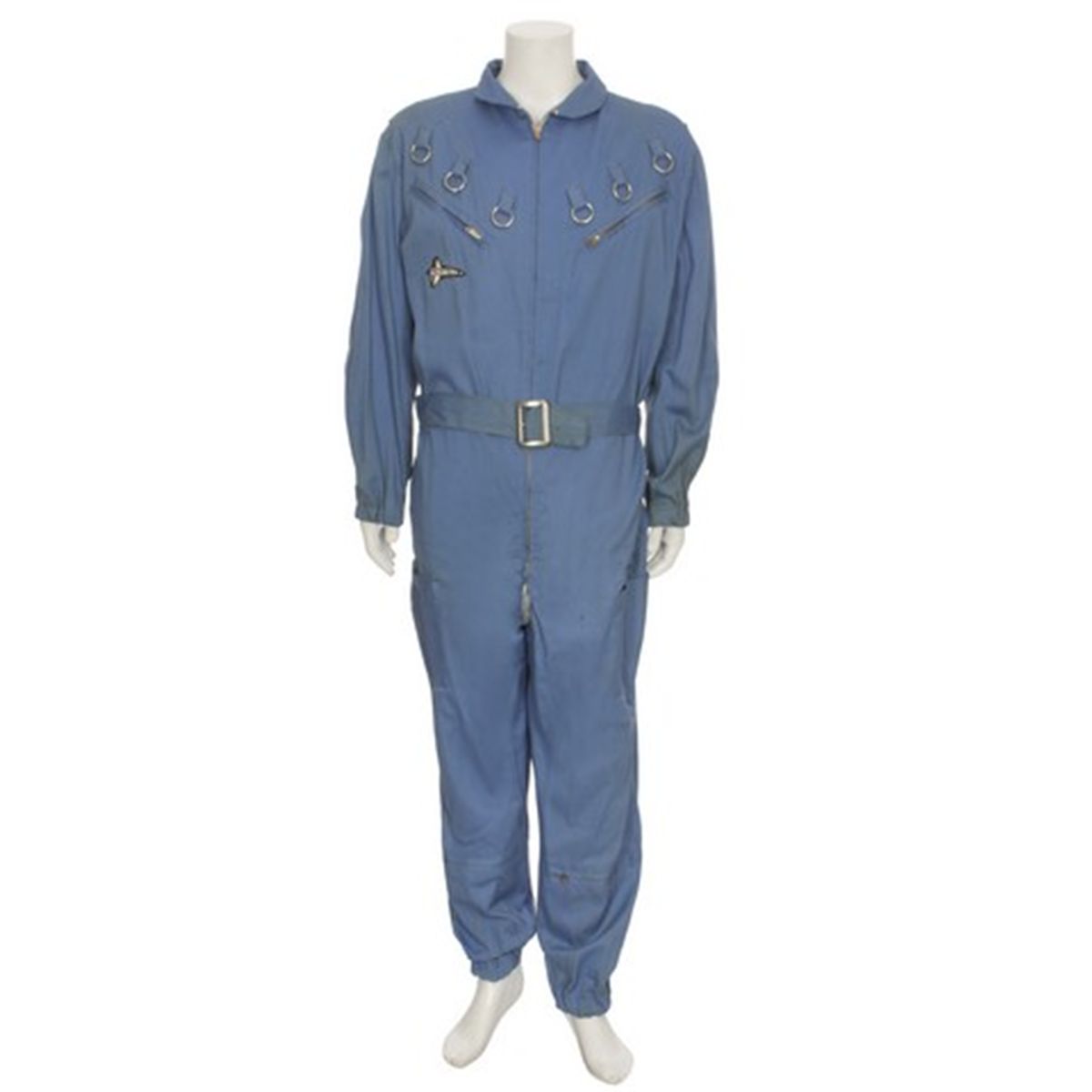 This pair of blue coveralls was worn by a background "Cleaning Crew" character in the 1982 sequel, "Airplane 2." The coveralls have metal rings and zippered pockets on the breast, two pouch pockets on the thighs, and have zippered front with a steel buckle belt. Comes complete with the original custom-made "Pan Universe" patch sewn on the left breast as seen in the film and also has an attached tag listing the title "Airplane" and costumer's notes. There are two holes in the suit that were made to be used with the wire harness the actor wore to "float" onscreen.