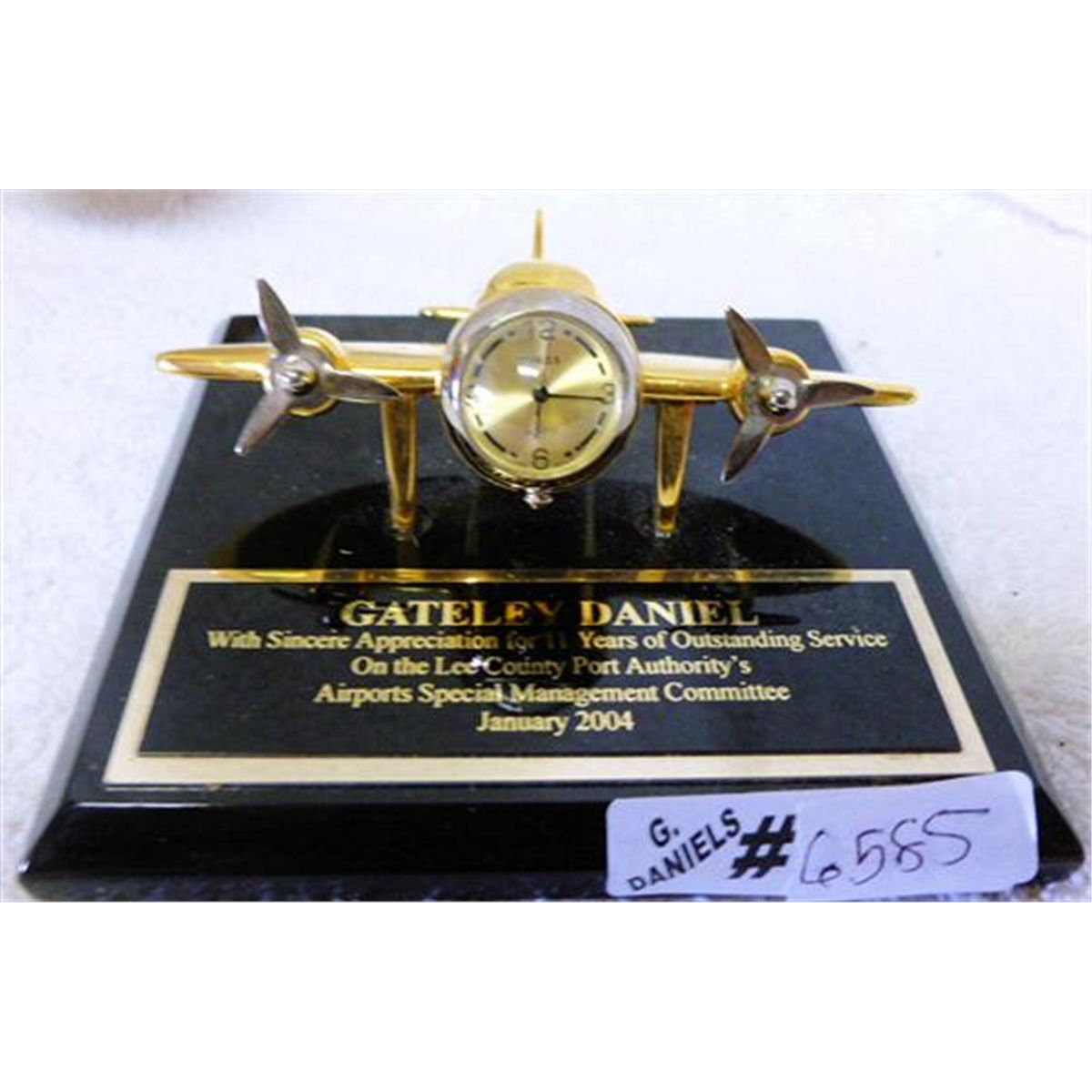 Airplane clock on desk top plaque - Gateley Daniels 11 years service Lee County port authority Jan. 2004 - Timex clock in the front of plane - 4 1/2 square