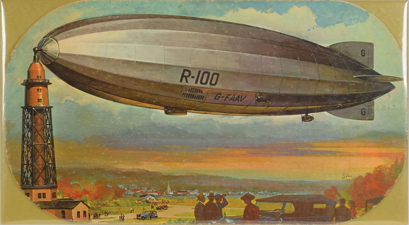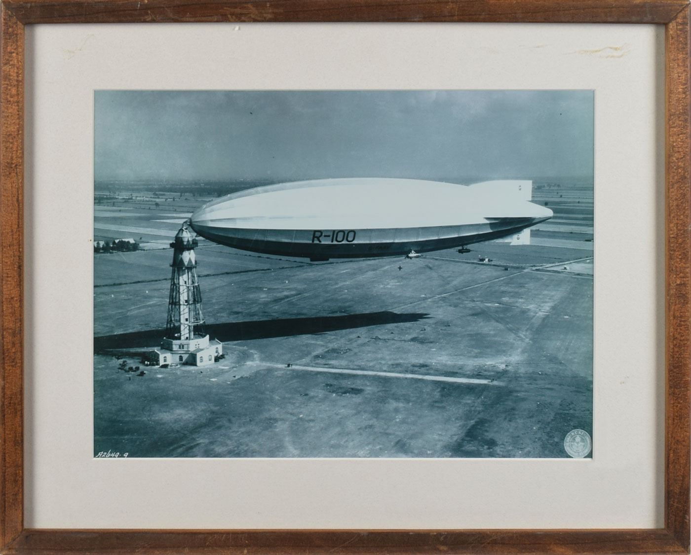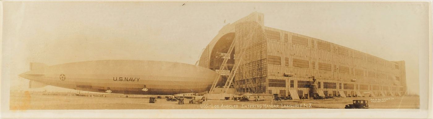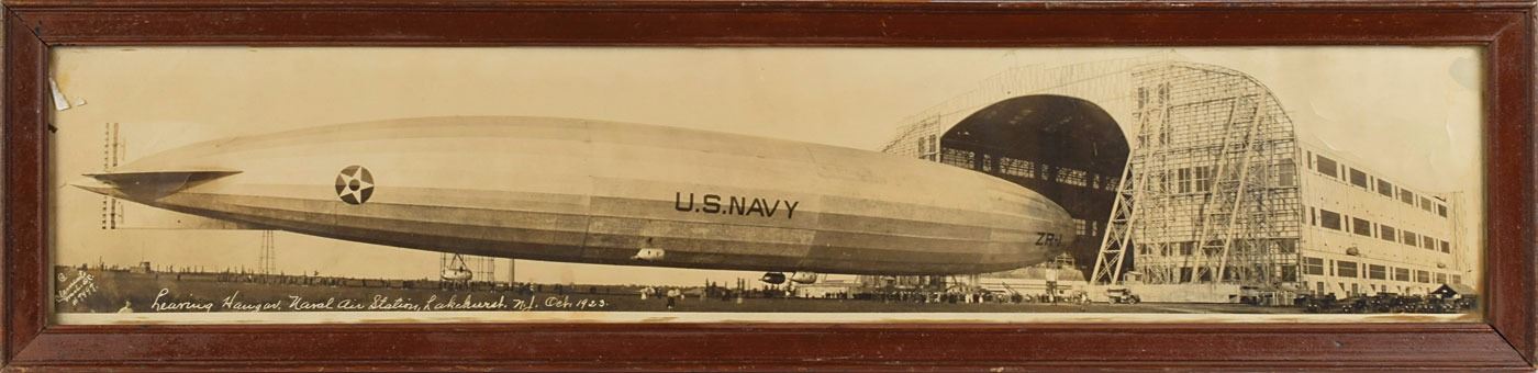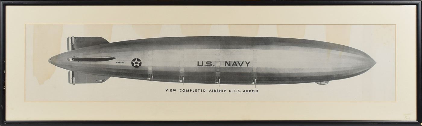 Group of six airship display items, including: a British World War I poster for the Daily Chronicle designed by Frank Brangwyn headed, "The Zeppelin Raids: The Vow of Vengeance," framed to an overall size of 22 x 32; a print depicting the USS Akron, matted and framed to an overall size of 41 x 12; an RCAF photo of a zeppelin marked "R-100," matted and framed to an overall size of 18.5 x 15; a vintage panoramic photo of the USS Shenandoah in 1923, framed to an overall size of 32 x 7.5; a color print of artwork depicting the R-100 zeppelin by "Eidson"; and a vintage panoramic 29 x 8 photo of the USS Los Angeles entering the hangar at Lakehurst, New Jersey. In overall very good to fine condition.