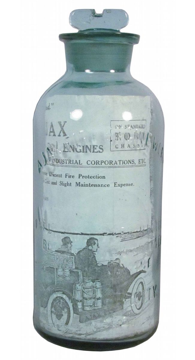 Ajax Chemical Fire Extinguisher. Embossed glass bottle with ground glass lid and top. No chips or cracks. 12 1/2 inches tall.