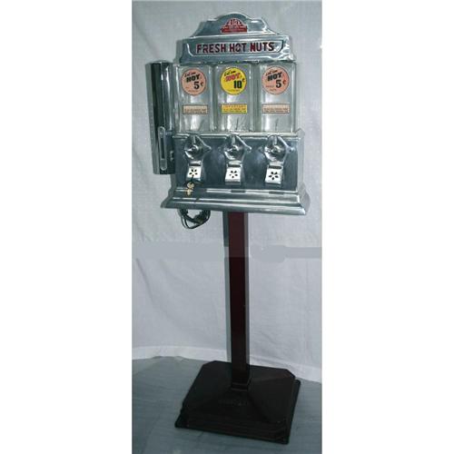 Fresh Hot Nuts - Triple Chrome Vendors with side cup vendor. On President Stand. Ajax Distributing Company. Vendors with cup measure 22" x 6" x 17" W. Beautiful chrome, excellent decals, repainted stand. Overall 50" H.