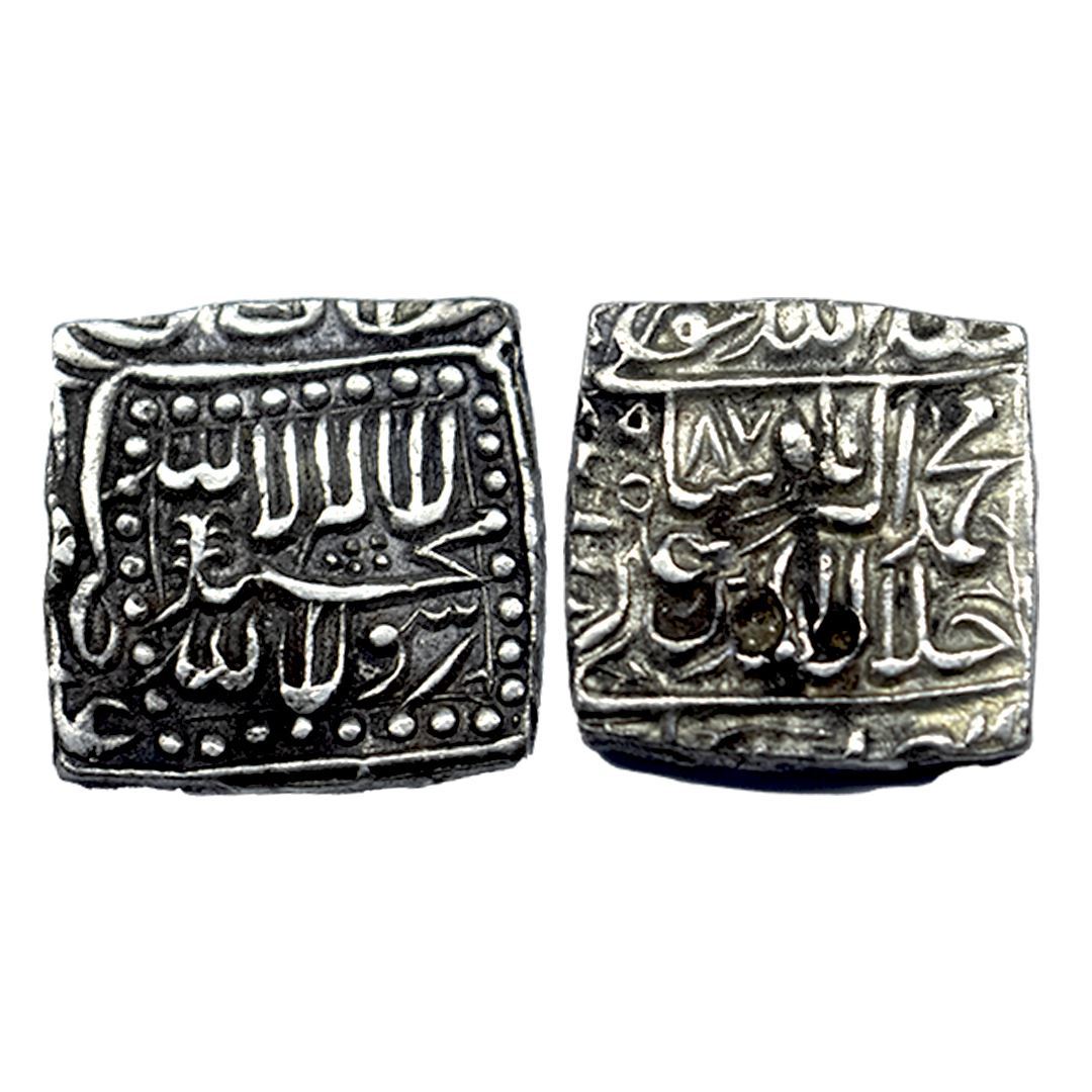 Akbar (1556-1605 AD), Silver Square Rupee, AH987 Bang Mint, KM A86.1. About Extremely Fine+, Rare. Dotted Border on one side complete, ate and mint on the other side, the dotted border variety is rare in Bang mint coins.
