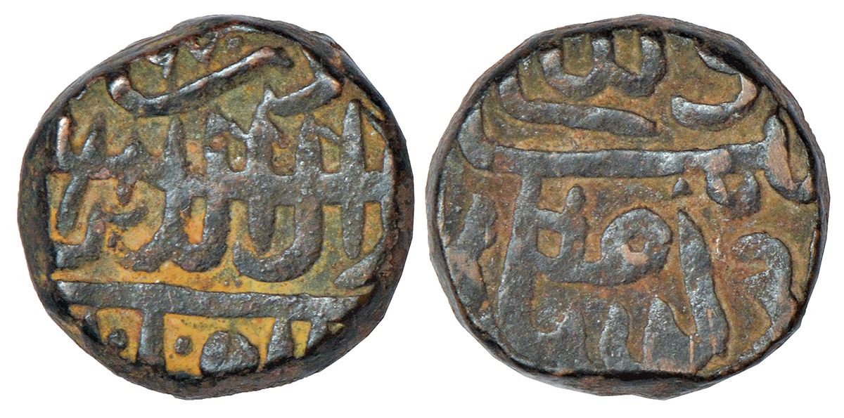 Akbar (1556-1605) - copper ½ Dam in local Gujarat fabric, copying design of silver issues of Ahmadabad dated AH970 on obverse and the legend of Gujarat Sultan Shams al-Din Mahmus Shah III on reverse. A highly unusual and interesting example of copper coinage struck in early Mughal period in Gujarat, 11.26g.
