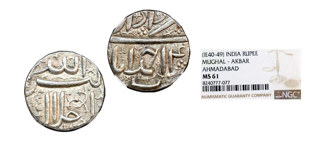 Akbar (AH 963-1014/1556-1605 AD), Ahmadabad Mint, Silver Rupee, Elahi 4x Month Azar (Sagittarius), Obv: Arabic legend "Jalla Jalalahu Allahu Akbar", Rev: Persian legend "Elahi 4x", month "Azar" & "zarb Ahmadabad" at the bottom, (KM# 93.2), choice quality, superb luster, graded by NGC as MS61