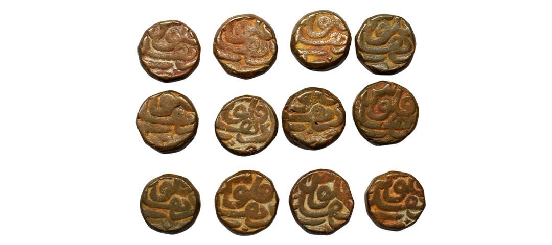 Akbar (AH 963-1014, 1556-1605 AD), Copper Dam, Delhi Mint, Full 12 Ilahi Months Set, KM #32.9, extremely fine, rare as a set.