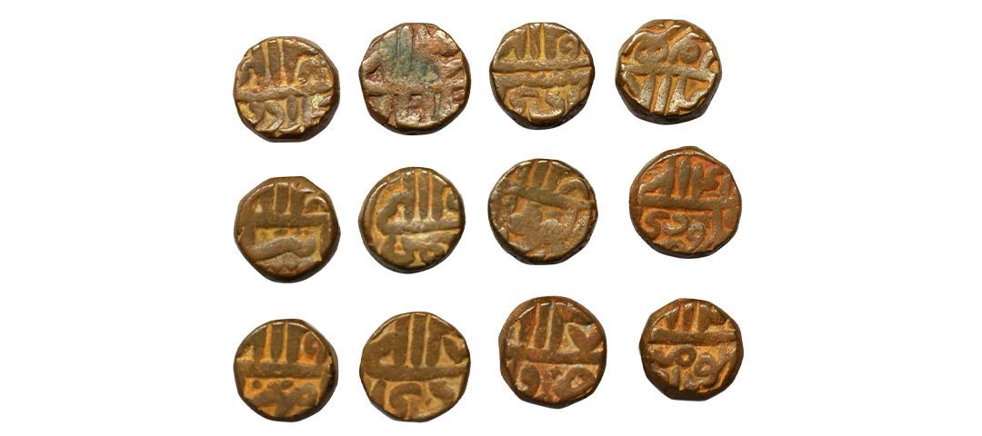 Akbar (AH 963-1014, 1556-1605 AD), Copper Dam, Delhi Mint, Full 12 Ilahi Months Set, KM #32.9, extremely fine, rare as a set.