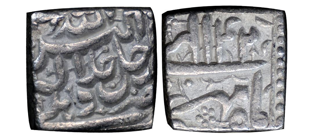 Akbar (AH 963-1014/1556-1605 AD), Delhi Mint, Silver Square Rupee, 11.40 gms, RY 42, Ilahi Month Mihir, Obv. Jallu Jalalahu Allahu Akbar zarb Delhi, Rev. Ilahi 42 mah mihir, KM #88.2, very fine+, very scarce.