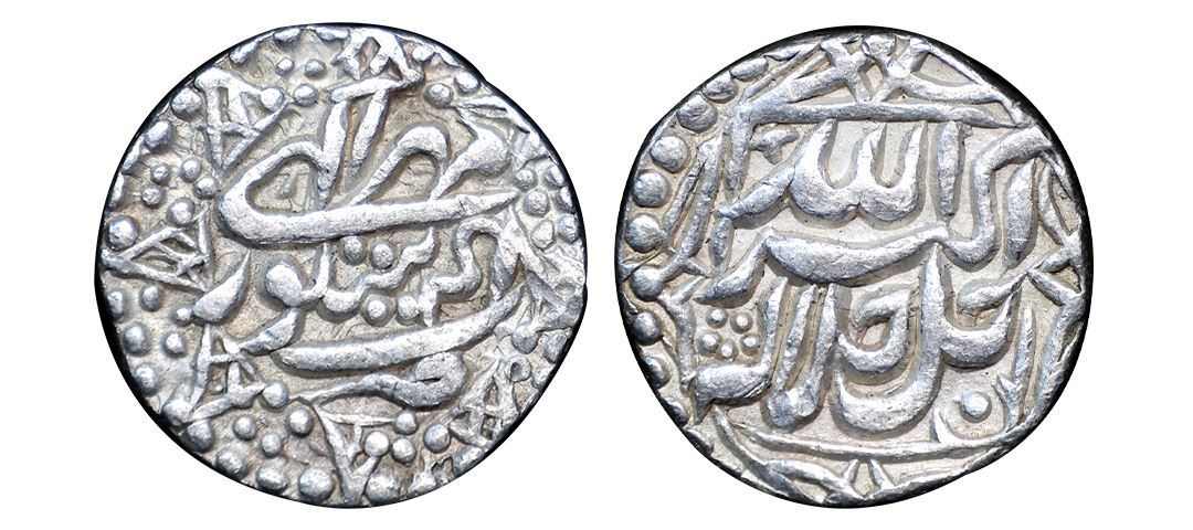 Akbar (AH 963-1014, 1556-1605 AD), Silver Rupee, 11.30 gms, Sitpur Mint, Ilahi Month Mihr (Libra), Year 48, Obv. Jalla Jalaluhu Allahu Akbar within a quarter foil, Rev. zarb Sitpur with Ilahi 48 at the bottom & month Mihr at the top, in an octagonal border, KM # 93.18, extremely fine, rare.
