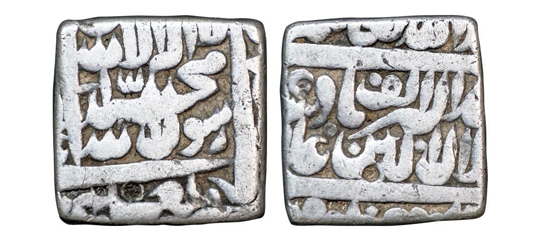 Akbar (AH 963-1014, 1556-1605 AD), Silver Square Rupee, 10.59 gms, Urdu Zafar Qarin Mint, AH Alif (1000), KM # 82.8, very fine+, very scarce.