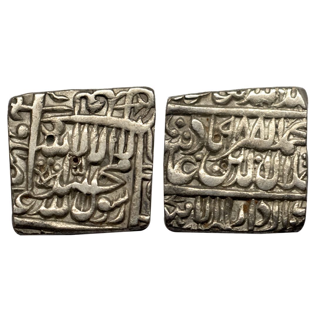 Akbar (AH 963-1014, 1556-1605 AD), Silver Square Rupee, 11.26 gms, Dar-us-Sultanat Lahore Mint, AH 988, KM # 82.5, very fine, very scarce.