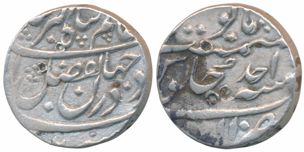 Akbar ’Adil (AH 1166, 1752 AD), Silver Rupee, 11.27g, Allahabad Mint, Regnal Year Ahd, Obverse: sikka zad dar Jahan bafazl-i-alah shah ’alam Panah Akbar shah, “Struck coin in the world by the grace of the almighty, the King and Refuge of the World, Akbar Shah”, with traces of the date (1166) below, Reverse: manus maimanat sanah julus ahd, zarb Allahabad “Struck coin at Allahabad in the tranquil first year of the reign” (KM 763, See article by Paul Stevens & Jan Lingen JONS 201). Very Fine+, one of only four known specimens.