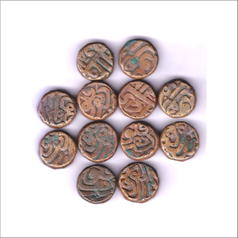 Akbar, Copper Dam (12), Dehli Mint, Ilahi type, complete set of 12 different Ilahi months, Farwardin, Khurdad, Ardibihisht, Tir, Bahman, Mihr, Azar, Aban, Shahrewar, Isfandarmuz, Amardad and Di.