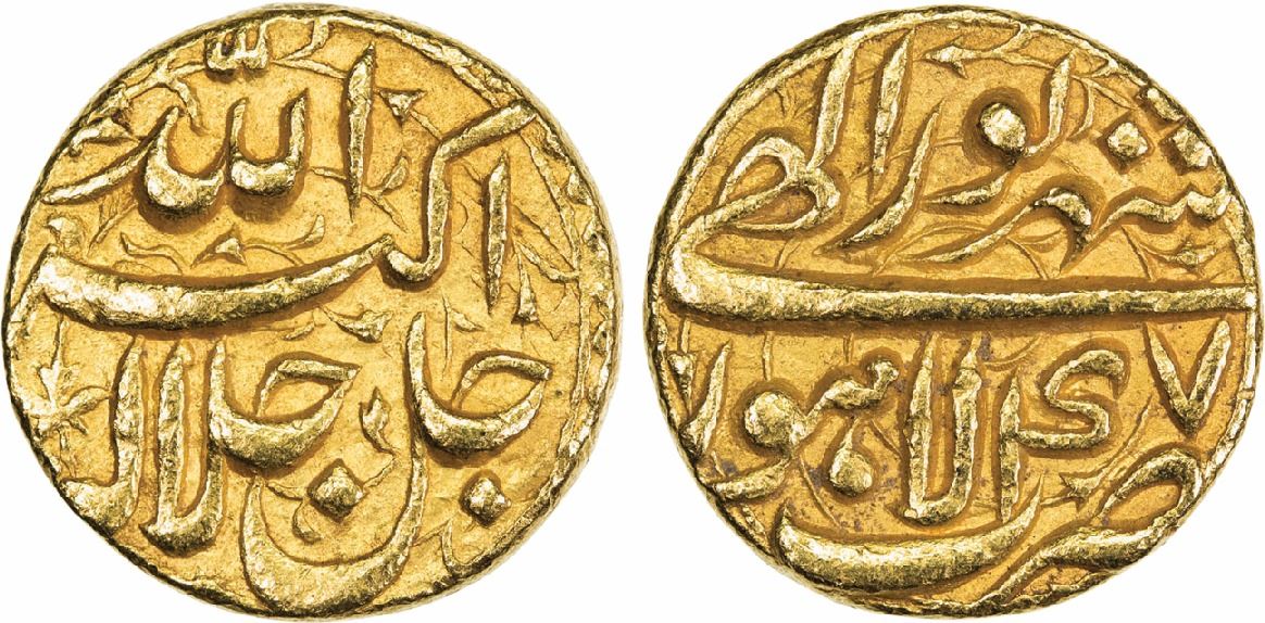 Akbar, Gold Mohur, 10.89g, Lahore Mint, Ilahi type, Month Shahrewar, Year 47, Obverse: Allahu Akbar Jale Jallaluhu, that is ‘Allah is great, may his glory shine forth’; a pun indicating Akbar is Allah, Reverse: Shahrewar Ilahi Zarb Lahore 47 (KM 114.6). About Extremely Fine, Very Rare.