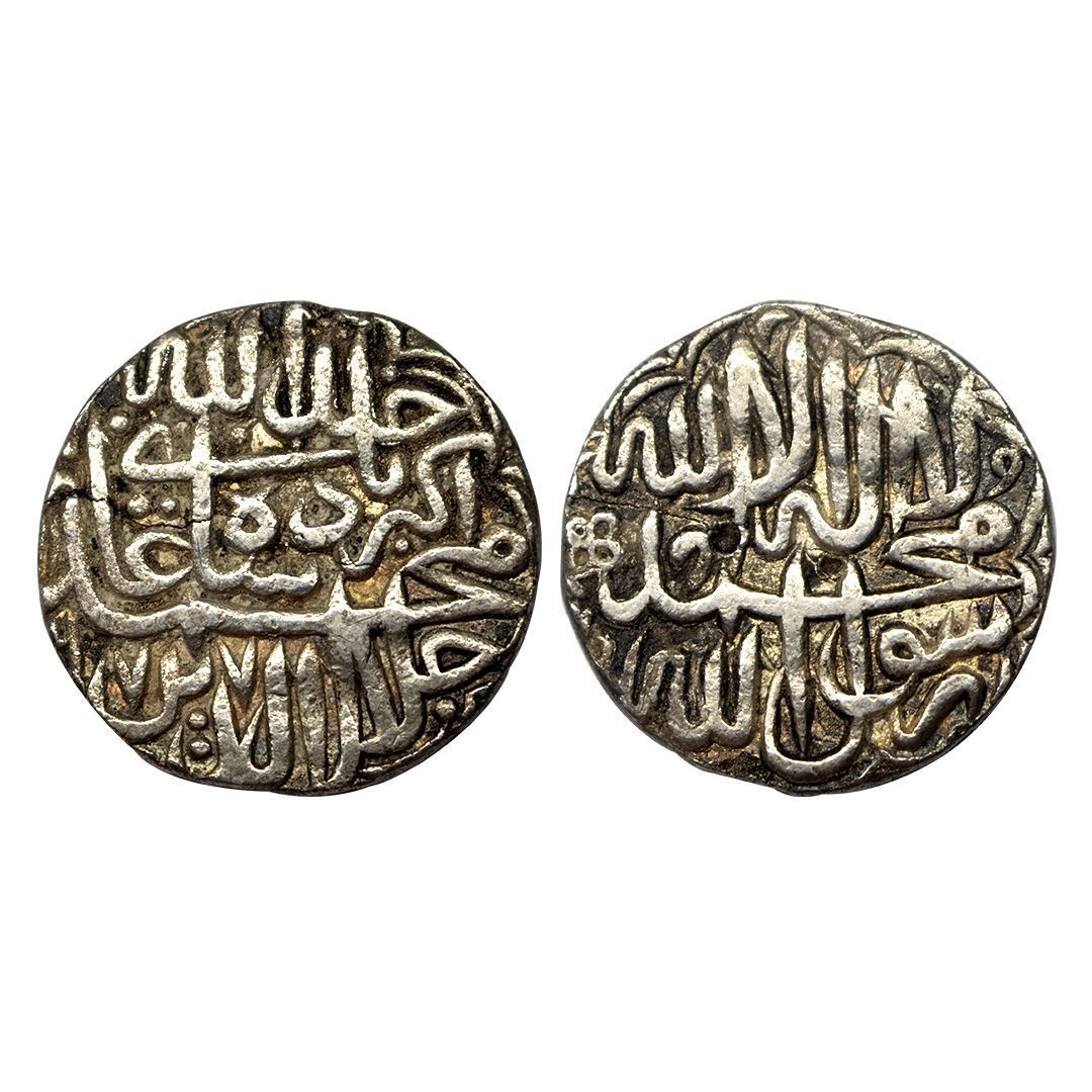 Akbar, Lahore Mint, Silver, Rupee, Kalima type, AH 977, Mint name off flan at bottom on rev (GR# 4.73). Double-scalloped type. Test marks, Very Fine+, Rare.
