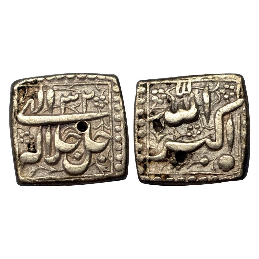 Akbar, Mintless, Silver, Square Rupee, Allahu Akbar type, Ilahi 32, without Month name. Allahu Akbar on obv, Ilahi and year at top, and Jale Jalalhu at bottom on rev. Deeply struck with very high relief legends, Test marks, but About Extrenely Fine, Rare.