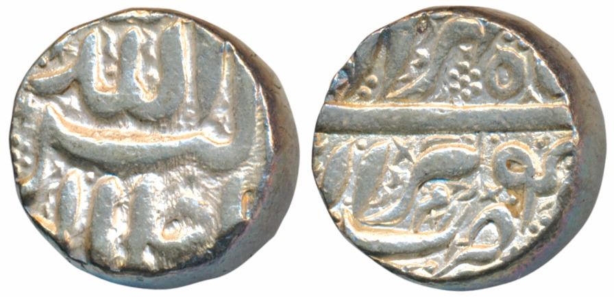 Akbar, Silver Rupee, 11.41g, Berar Mint, Ilahi type, Month Mihr, ’Ram’ written in Persian below the mint name, Year 4X (KM 93.6). Extremely Fine, Rare.