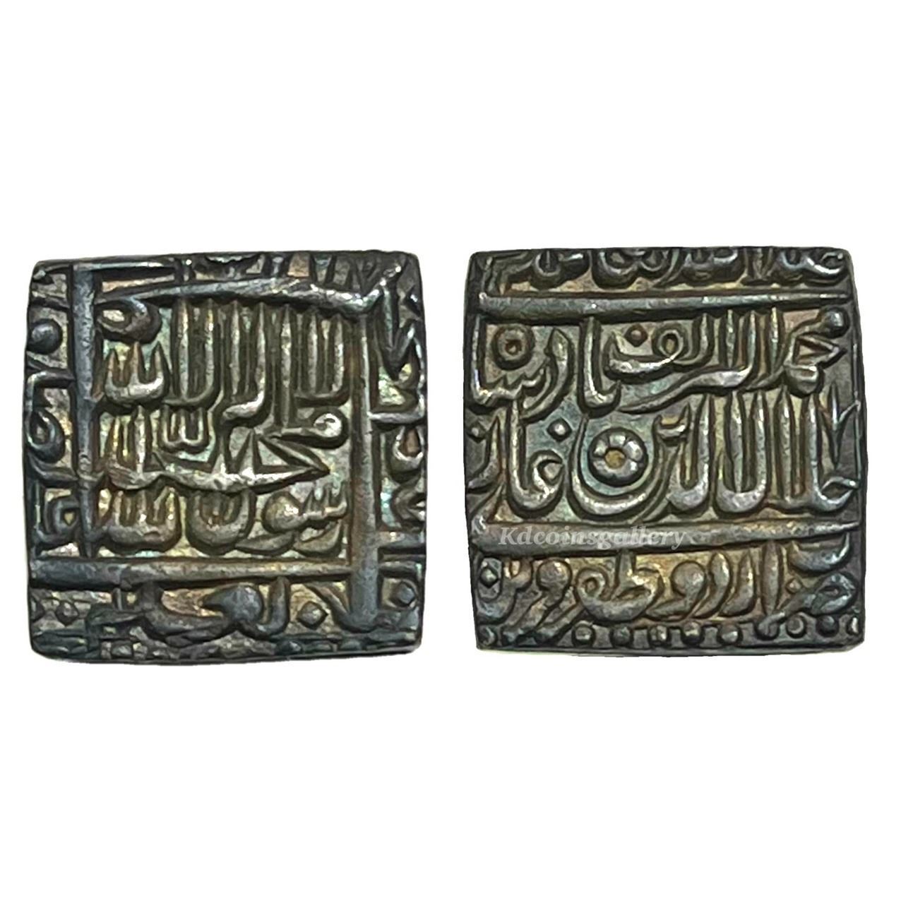 Akbar, Silver Square Rupee, 11.30g, Urud Zafar Qarin Mint, AH Alif (1000), Kalima type, complete mint name on rev. bottom, like a flower symbol on rev.(KM # 82.8). Uncirculated, rare.