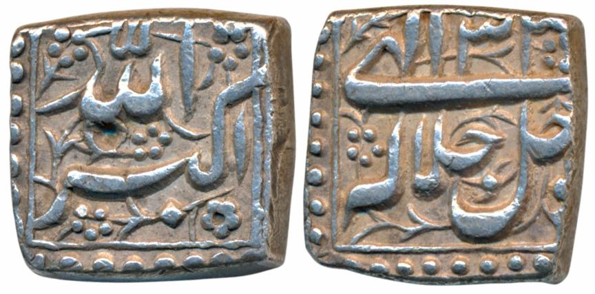 Akbar, Silver Square Rupee, 11.34g, obv. Allahu Akbar, rev. Jale Jallaluhu, mintless and monthless type, Year 33, floral decorated fields (KM 91.1). Extremely Fine.