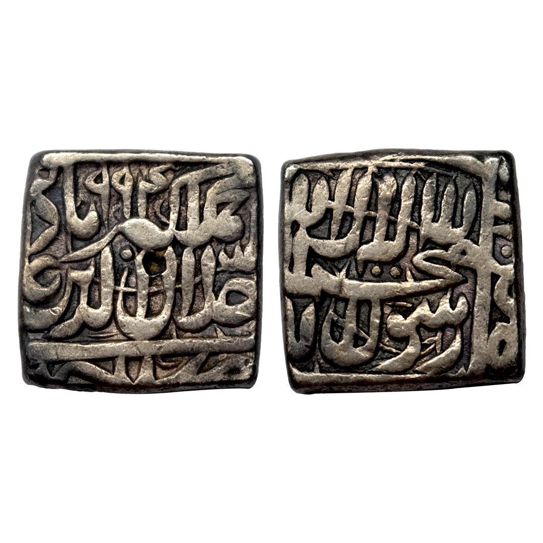 Akbar, Ujjain mint, Silver, Square Rupee, Kalima, Al-zarb Ujjain mint name at bottom on rev, Square-area type on obv, AH 994 (GR# 4.170). Centrally srtruck on obv. Test marks, Very Fine, Rare.