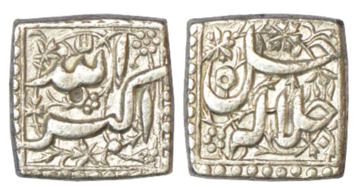 Akbar (1556-1605 AD), silver square rupee, mintless and dateless type, KM 91.1, 11.35g, with Allahu Akbar on obverse and Jal Jalalahu on reverse, variety with 'Jim' of 'Jal' extended into a long stroke, floral decorative fields on both sides.