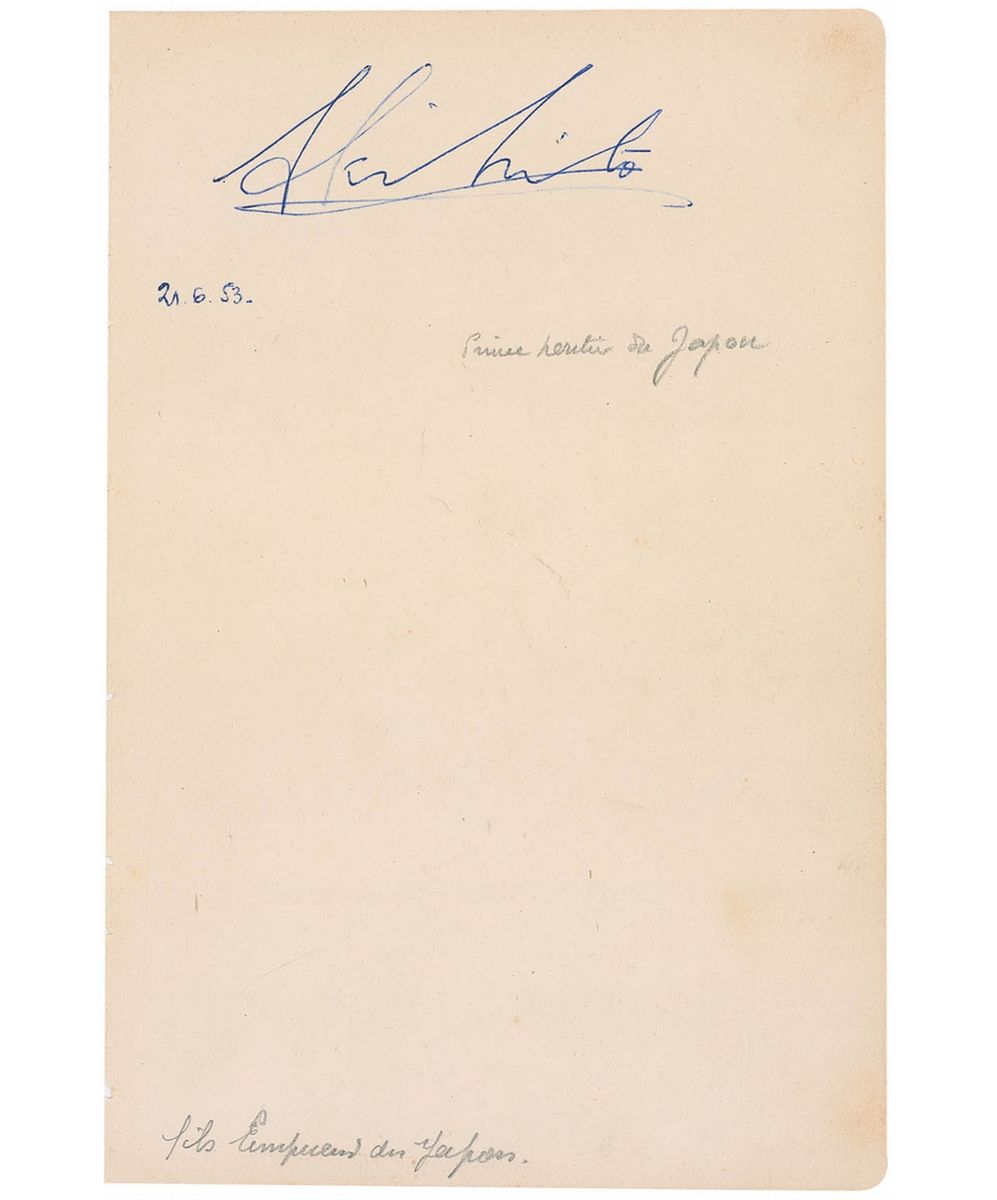 Emperor of Japan (born 1933) from 1989 to the present. Scarce early vintage ballpoint signature, “Akihito 21.6.53,” on an off-white 6.25 x 9.5 album page, with a couple collector’s pencil notations to page. In fine condition.