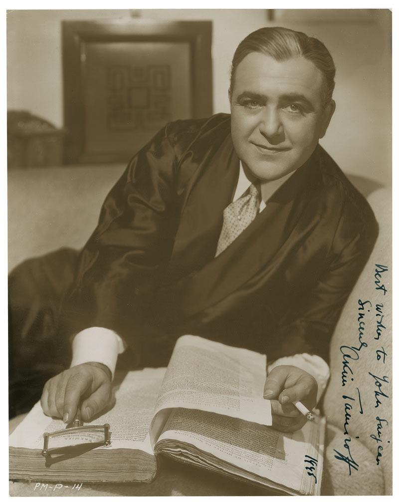 Vintage sepia glossy 7.5 x 9.5 photo of the actor browsing a book, signed and inscribed vertically in fountain pen “Best wishes to John Sarjean, Sincerely, Akim Tamiroff 1945.” In fine condition, with lightly trimmed edges.