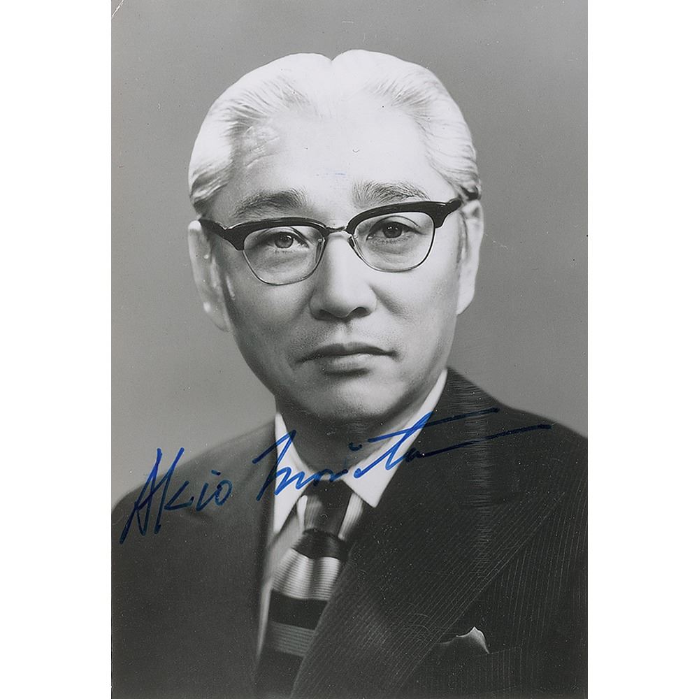 Japanese physicist and businessman (1921-1999) who co-founded the Sony Corporation. Glossy 3.5 x 5 portrait of Morita, signed in blue felt tip. In fine condition, with a trivial corner tip crease to the upper left.