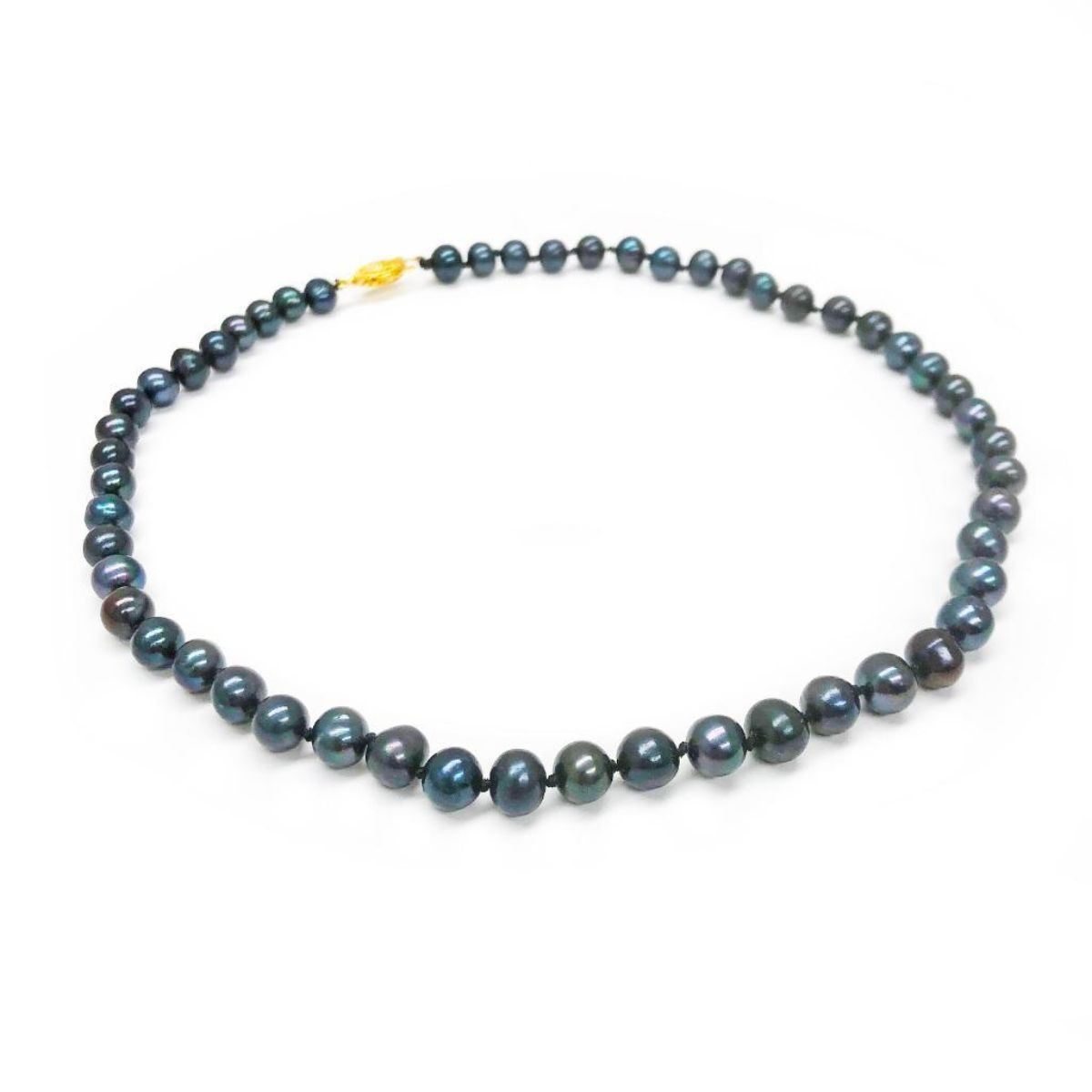 An Akoya Black Pearl Ladies Hand Knotted Necklace With 53 Pearls With Hook Clasp. Each Pearl Has A Unique Blue & Purple Luster That Bring Out The Beauty Of This Ladies Piece Of Jewelry. View Photos For Further Details.