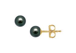 A pair of round akoya pearl stud earrings with a size of 5 mm is made in 14K yellow gold. These pearl studs are available in either screw-back or push-back.