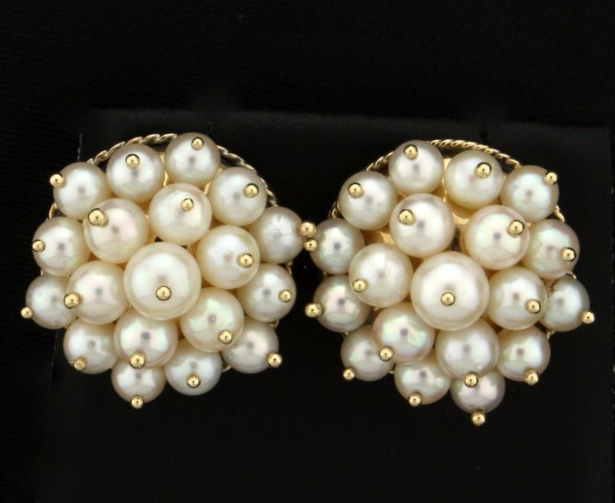 In 14k yellow gold. Each earring contains 19 high quality pearls ranging from 4.5 to 5.5mm each with excellent color and luster. 3/4" in diameter with friction backs for pierced ears. 11.2g.