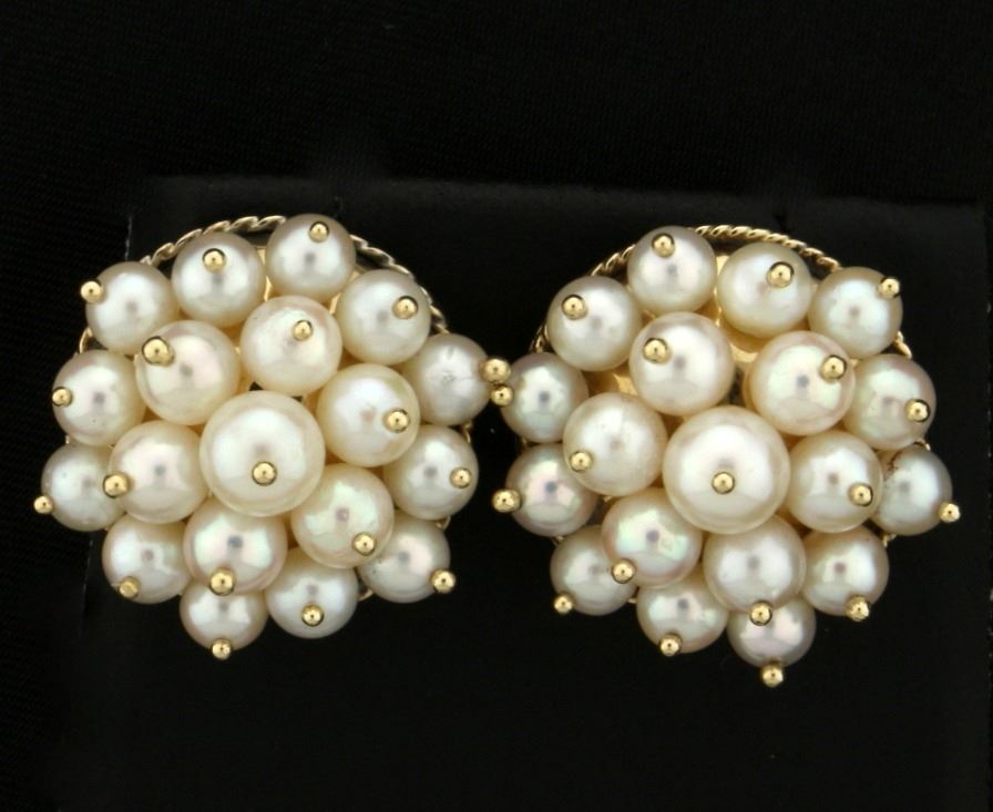 In 14k yellow gold. Each earring contains 19 high quality pearls ranging from 4.5 to 5.5mm each with excellent color and luster. 3/4" in diameter with friction backs for pierced ears. 11.2g.