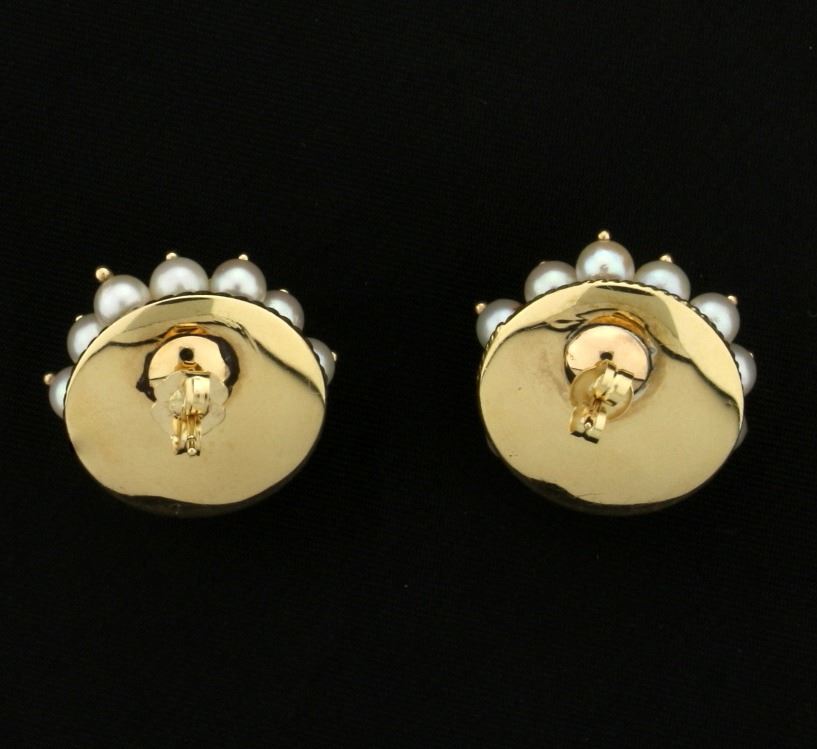 In 14k yellow gold. Each earring contains 19 high quality pearls ranging from 4.5 to 5.5mm each with excellent color and luster. 3/4" in diameter with friction backs for pierced ears. 11.2g.