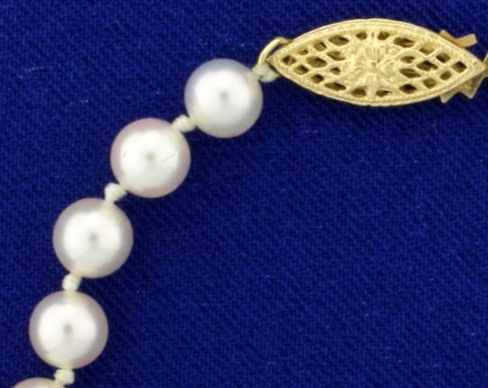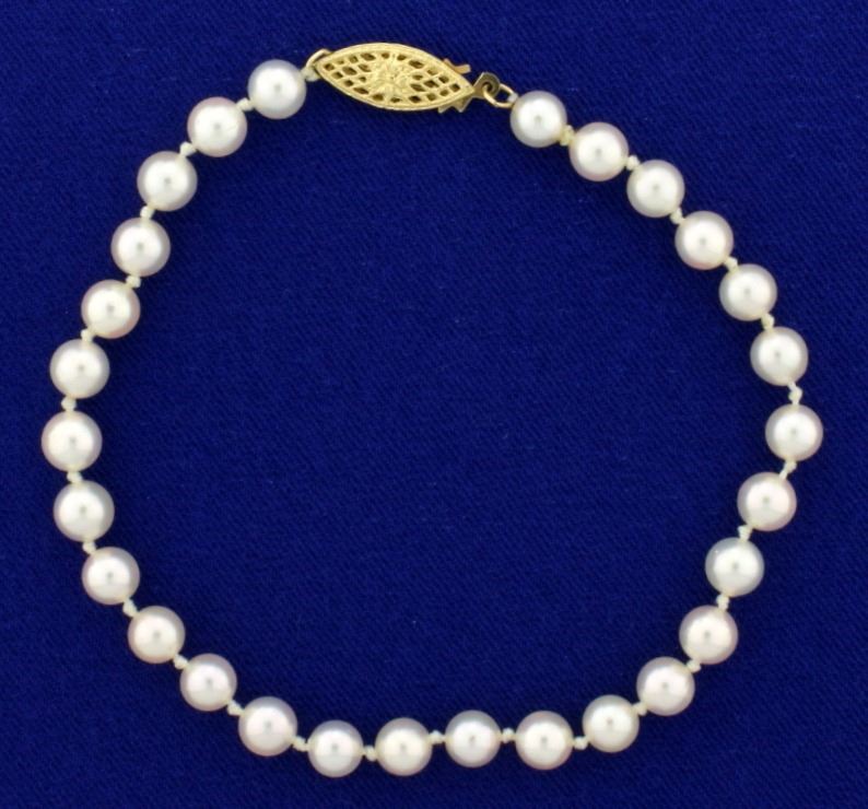 In 14k yellow gold. Contains 28 high quality 5mm Akoya Pearls with excellent color and luster. 7 3/4" long. 6.1g.