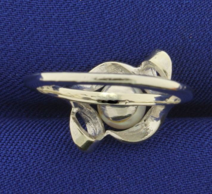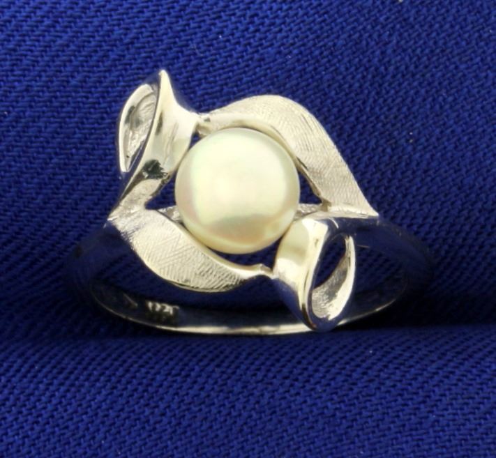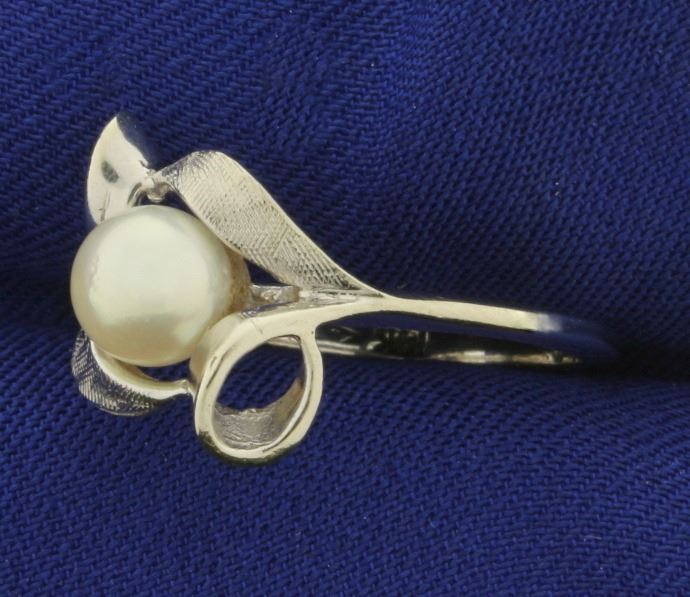 In 14k white gold. Contains a 6mm Akoya Pearl with excellent color and luster. Size 6 1/2. 3.0g.