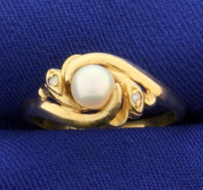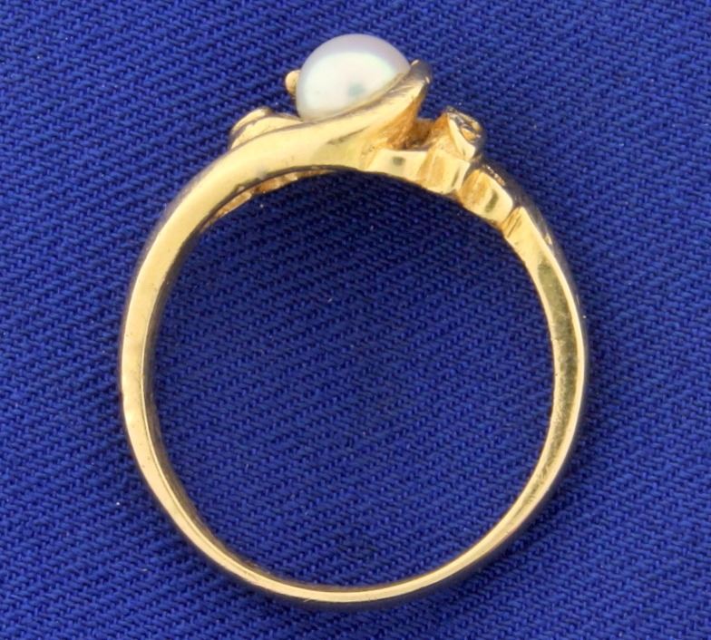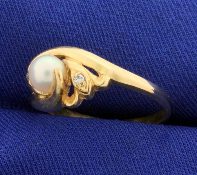 In 14K Yellow Gold. Contains a 5mmAkoya Pearl with great color and luster. Also contains two high quality .01ct Diamonds, SI clarity/H color. Size 8 1/2. 3.6g