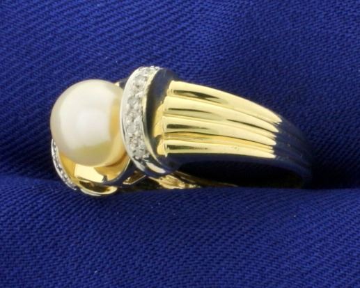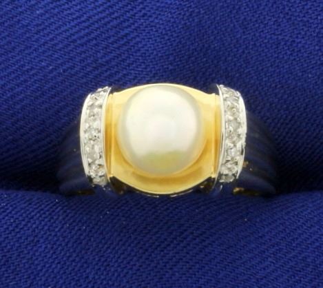In 14k yellow and white gold. Contains an 8mm Akoya pearl with excellent color and luster. Also contains ten high quality .01ct diamonds, SI clarity/H color. Size 7. 5.1g.