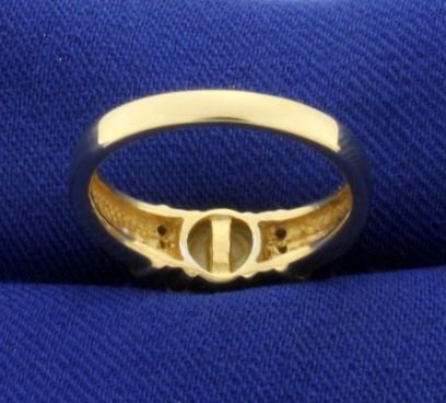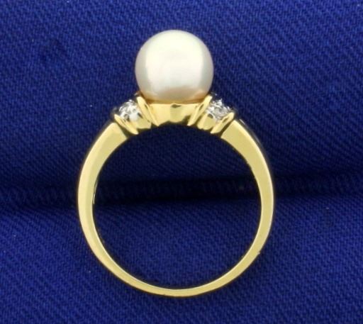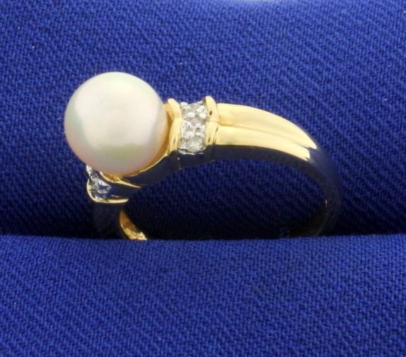 In 14k yellow gold. Contains a 7.3mm pearl with excellent color and luster, surrounded by six high quality 1/2pt diamonds. Size 5. 3.3g.