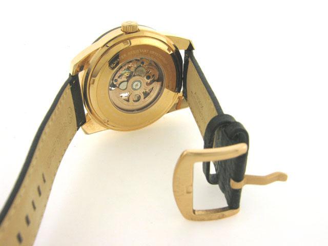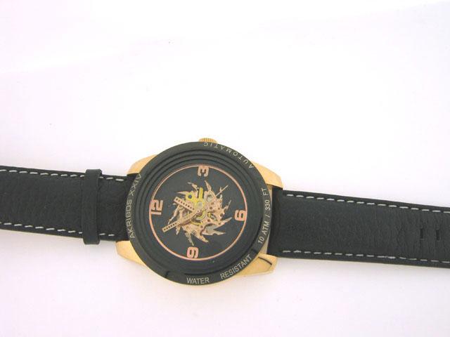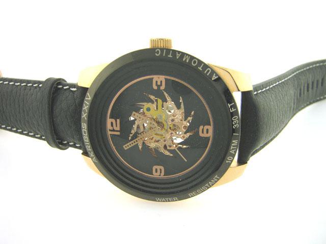 This is an Akribos XXIV Men's AK448RG 'Shutter' Automatic Skeleton Round Rose Gold Watch with the following features: Black genuine sport leather strap with white contrast stitching and brushed rose gold tang buckle with engraved Akribos XXIV logo; Rose gold perforated film minute and hour hands and Rose gold applied numerals on inside of crystal at 12, 3, 6 and 9 o'clock positions; Round IP rose gold stainless steel polished case with rose gold skeleton dial with partly open diaphragm shutter design; Watch features front and exhibition back Krysterna crystal; and Water-resistant to 330 feet (100 M)