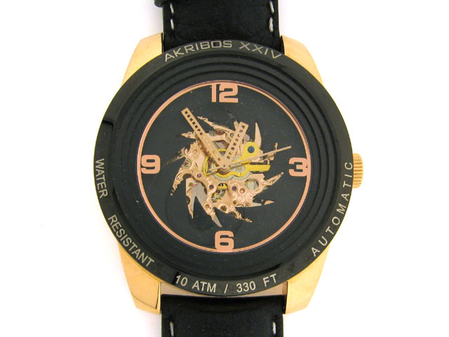 This is an Akribos XXIV Men's AK448RG 'Shutter' Automatic Skeleton Round Rose Gold Watch with the following features: Black genuine sport leather strap with white contrast stitching and brushed rose gold tang buckle with engraved Akribos XXIV logo; Rose gold perforated film minute and hour hands and Rose gold applied numerals on inside of crystal at 12, 3, 6 and 9 o'clock positions; Round IP rose gold stainless steel polished case with rose gold skeleton dial with partly open diaphragm shutter design; Watch features front and exhibition back Krysterna crystal; and Water-resistant to 330 feet (100 M)