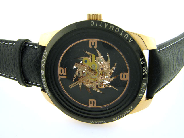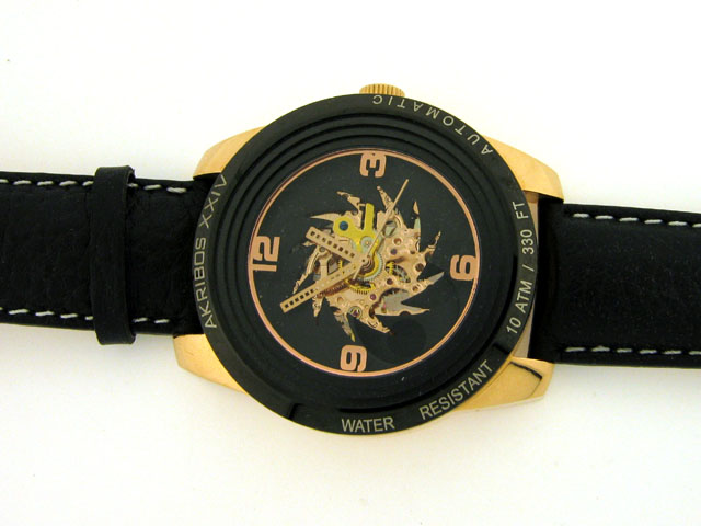 This is an Akribos XXIV Men's AK448RG 'Shutter' Automatic Skeleton Round Rose Gold Watch with the following features: Black genuine sport leather strap with white contrast stitching and brushed rose gold tang buckle with engraved Akribos XXIV logo; Rose gold perforated film minute and hour hands and Rose gold applied numerals on inside of crystal at 12, 3, 6 and 9 o'clock positions; Round IP rose gold stainless steel polished case with rose gold skeleton dial with partly open diaphragm shutter design; Watch features front and exhibition back Krysterna crystal; and Water-resistant to 330 feet (100 M)