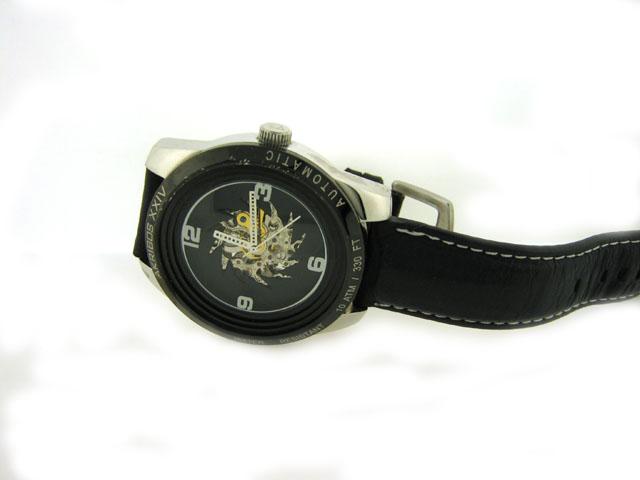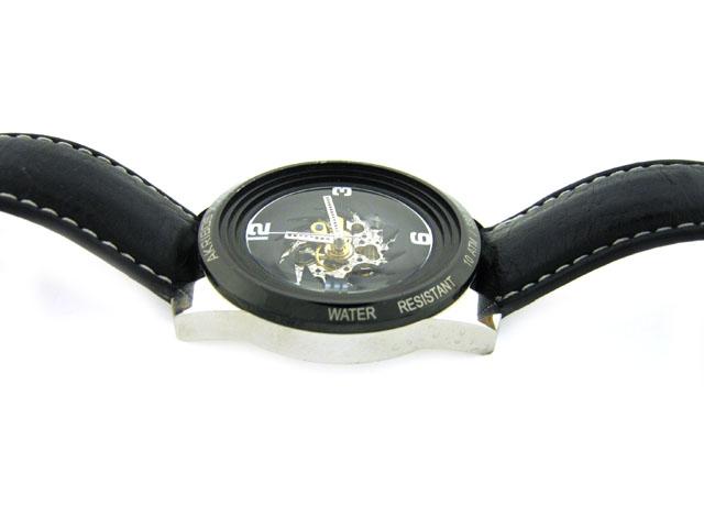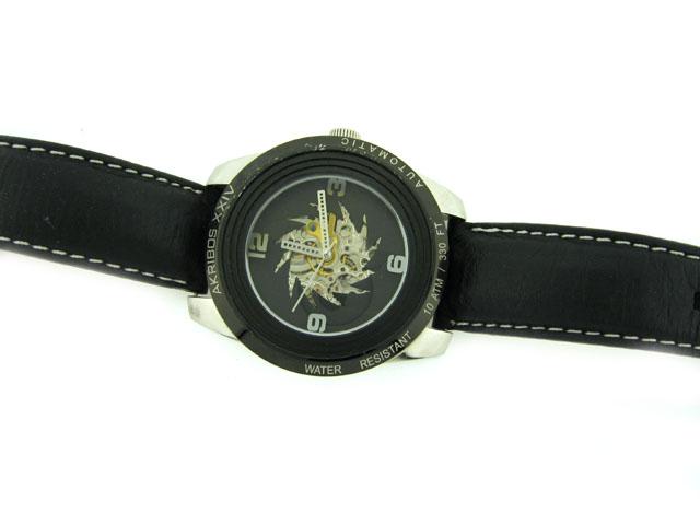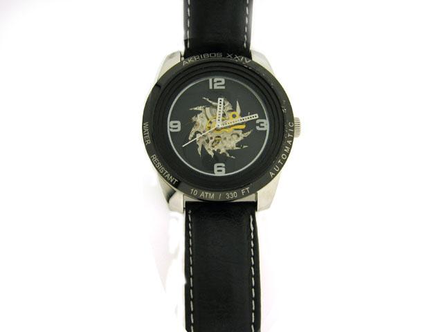 This is an Akribos XXIV Men's 'Shutter' Automatic Skeleton Round Stainless Watch #AK448SS with the following features: black dial with a partly open diaphragm shutter design that exposes the silver-tone gears inside; automatic self-winding watch; Silver-gold tone numerals, minute and hour hands; Case back is made of Krysterna, a durable synthetic sapphire; silver-tone stainless steel case; black plastic bezel; black leather strap with white contrast stitching with a brushed silver-tone tang buckle and an engraved Akribos XXIV logo; and water-resistant to 330 feet (100 meters).