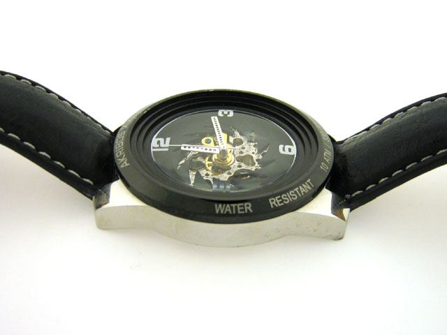 This is an Akribos XXIV Men's 'Shutter' Automatic Skeleton Round Stainless Watch #AK448SS with the following features: black dial with a partly open diaphragm shutter design that exposes the silver-tone gears inside; automatic self-winding watch; Silver