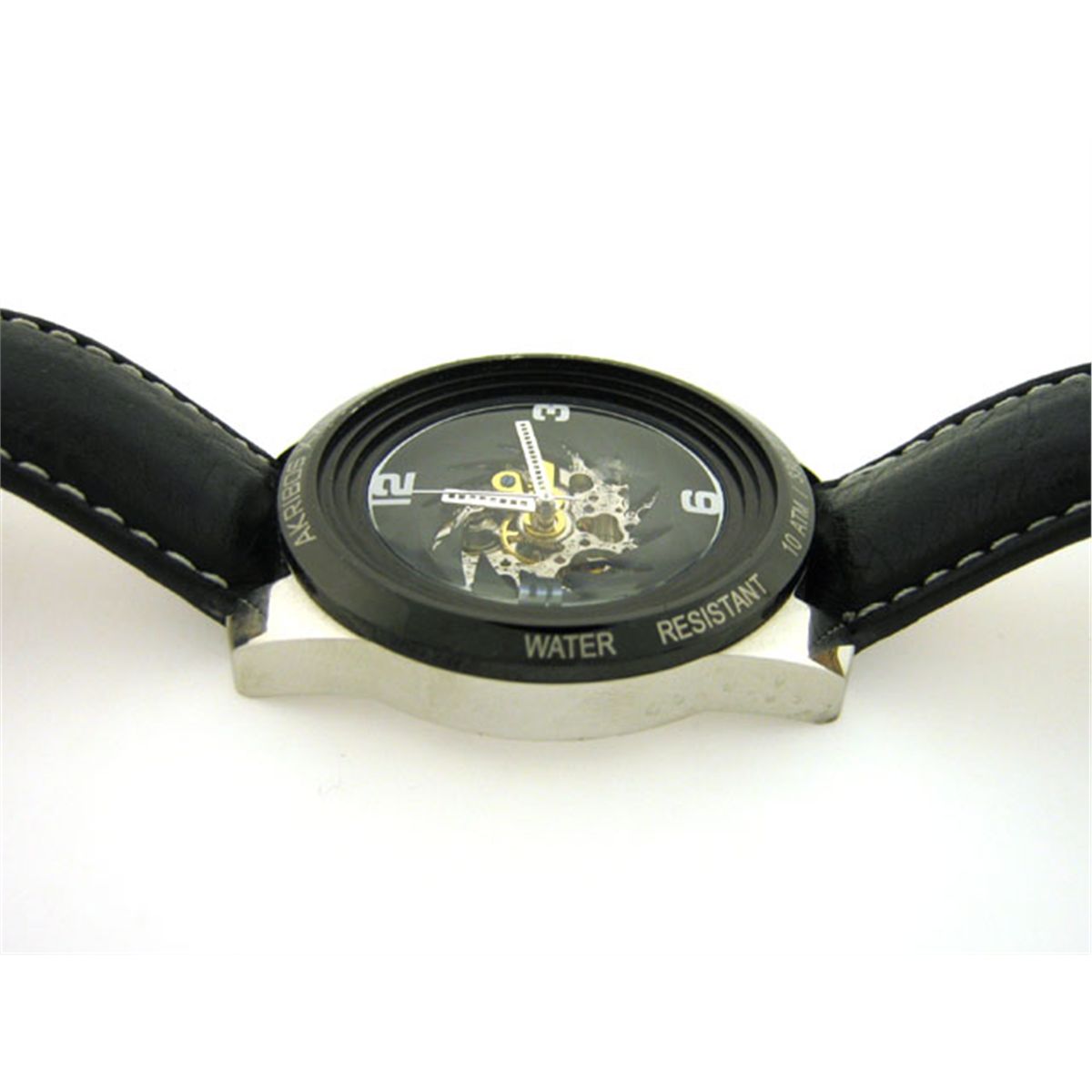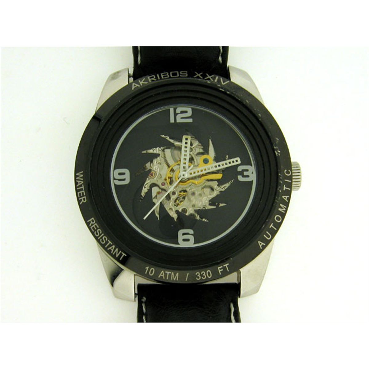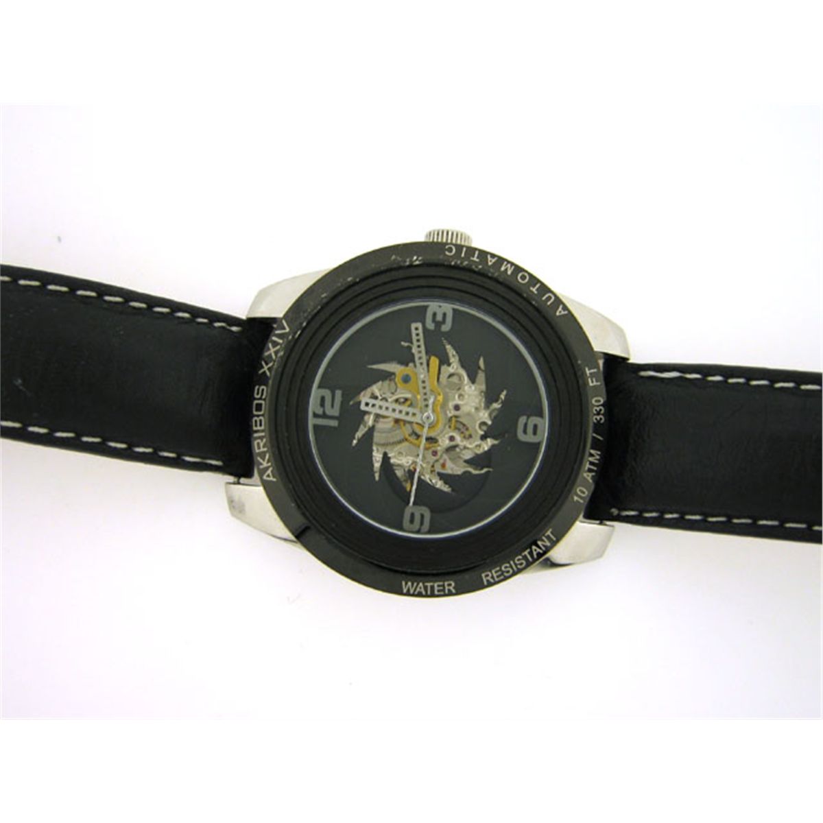 This is an Akribos XXIV Men's 'Shutter' Automatic Skeleton Round Stainless Watch #AK448SS with the following features: black dial with a partly open diaphragm shutter design that exposes the silver-tone gears inside; automatic self-winding watch; Silver-gold tone numerals, minute and hour hands; Case back is made of Krysterna, a durable synthetic sapphire; silver-tone stainless steel case; black plastic bezel; black leather strap with white contrast stitching with a brushed silver-tone tang buckle and an engraved Akribos XXIV logo; and water-resistant to 330 feet (100 meters).
