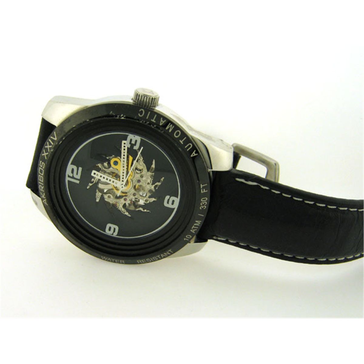 This is an Akribos XXIV Men's 'Shutter' Automatic Skeleton Round Stainless Watch #AK448SS with the following features: black dial with a partly open diaphragm shutter design that exposes the silver-tone gears inside; automatic self-winding watch; Silver