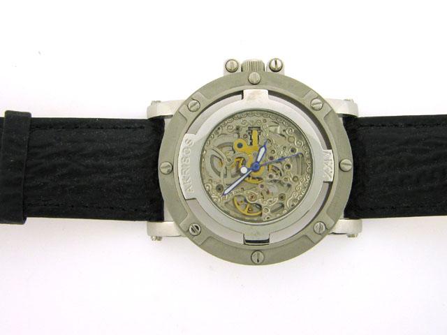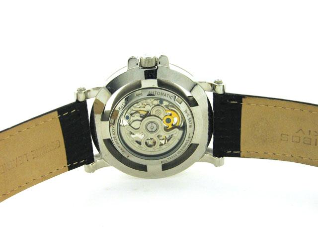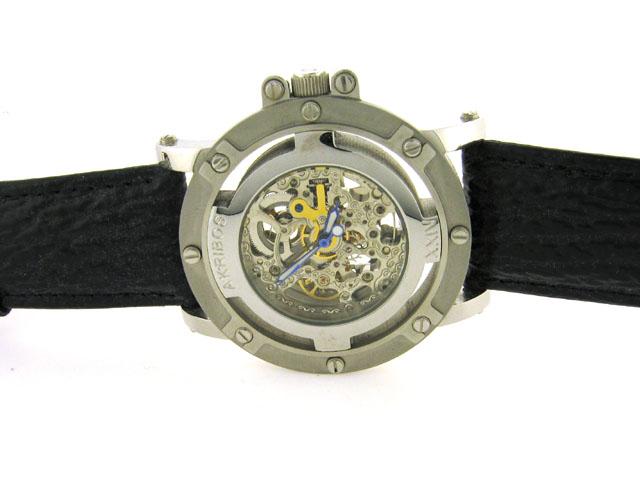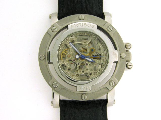 This is an Akribos XXIV Monster Rig Men's Automatic Strap Watch with the following features: Stainless steel Case; Stainless steel, Krysterna, screw-down Caseback; Stainless skeletal dial, outer ring encloses the movement; Silvertone and luminous Hands; leather Strap; Tang buckle with engraved Akribos XXIV logo Clasp; Shatter-resistant Krysterna Crystal; Push/pull Crown; Automatic, 2183 Movement; 10 ATM/100 meters/330 feet Water resistance; 50 mm wide x 50 mm long x 13.5 mm thick Case measurements; and 26 mm wide x 9 inches long Strap measurements