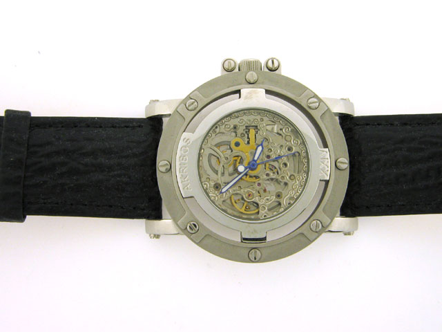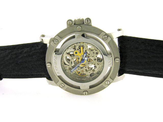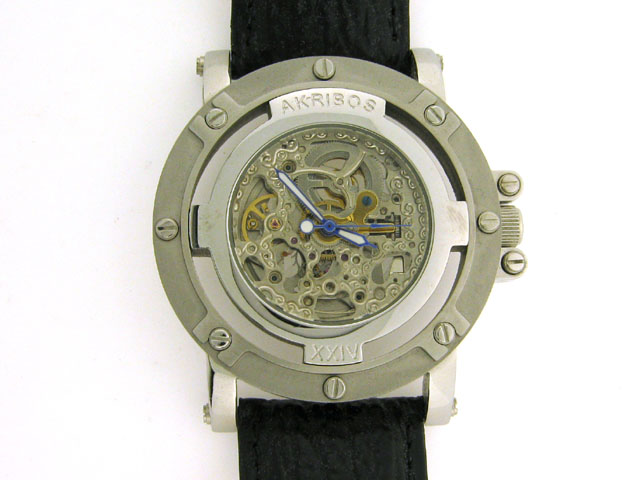 This is an Akribos XXIV Monster Rig Men's Automatic Strap Watch with the following features: Stainless steel Case; Stainless steel, Krysterna, screw-down Caseback; Stainless skeletal dial, outer ring encloses the movement; Silvertone and luminous Hands;