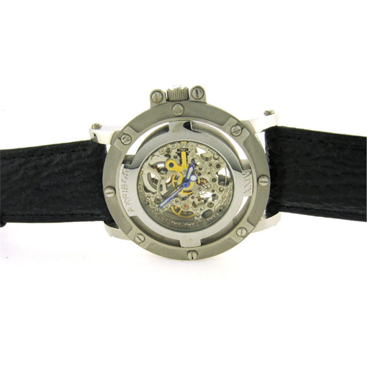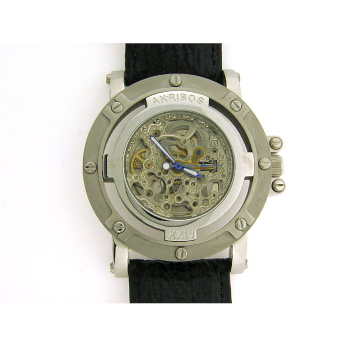 This is an Akribos XXIV Monster Rig Men's Automatic Strap Watch with the following features: Stainless steel Case; Stainless steel, Krysterna, screw-down Caseback; Stainless skeletal dial, outer ring encloses the movement; Silvertone and luminous Hands; leather Strap; Tang buckle with engraved Akribos XXIV logo Clasp; Shatter-resistant Krysterna Crystal; Push/pull Crown; Automatic, 2183 Movement; 10 ATM/100 meters/330 feet Water resistance; 50 mm wide x 50 mm long x 13.5 mm thick Case measurements; and 26 mm wide x 9 inches long Strap measurements