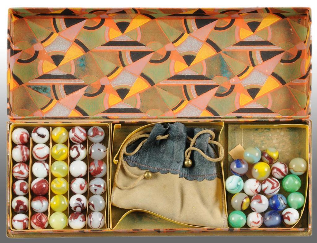 Includes 48 oxblood marbles with original bag. Size Box: 10 - 1/2" x 4".